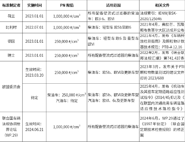 近年來,PN檢測進(jìn)一步擴(kuò)展至在用車輛的定期技術(shù)檢查(PTI)體系。目前荷蘭、比利時(shí)、德國、瑞士已正式實(shí)施PTI-PN法規(guī),歐盟委員會及聯(lián)合國WP.29也在積極推進(jìn)相關(guān)法規(guī)的制定。