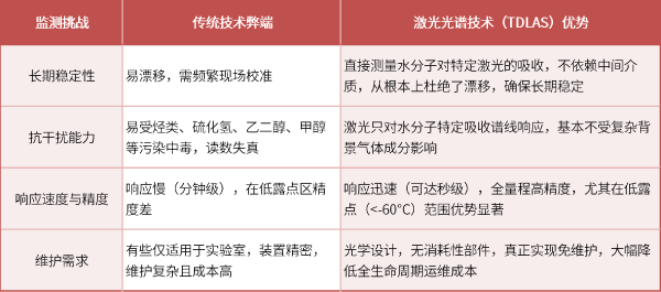 相比傳統(tǒng)的冷鏡法、電容法、氧化鋁法等,可調(diào)諧半導(dǎo)體激光吸收光譜技術(shù)實(shí)現(xiàn)了質(zhì)的飛躍: