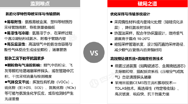 固定污染源氨逃逸在線監(jiān)測的核心難點源于氨自身的高水溶性、強吸附性與反應(yīng)活性,以及復(fù)雜惡劣的煙氣環(huán)境(高溫、高濕、高粉塵、酸性氣體共存)。這導(dǎo)致在樣品采集與傳輸過程中極易發(fā)生氨溶解于冷凝水、吸附于管路部件、或與酸性氣體反應(yīng)生成銨鹽而損失,造成測量值偏低和響應(yīng)延遲。同時,環(huán)保法規(guī)要求的ppm級超低濃度測量需求,對分析技術(shù)的靈敏度、選擇性和抗干擾能力提出了極高挑戰(zhàn)。