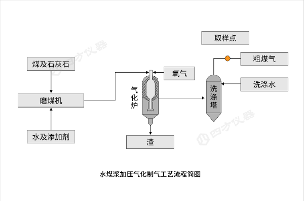 原料煤經(jīng)稱重、磨制、篩分后制成煤漿,再經(jīng)低壓和高壓輸送,與氧氣混合霧化噴入氣化爐發(fā)生氣化反應(yīng),生成主要含 H2、CO2、CO、H2O及少量 CH4、H2S等的水煤氣。在線自動(dòng)分析碳洗塔出口氣體成分,可以了解氣化爐的運(yùn)行情況,用于指導(dǎo)氣化爐及下游工序的操作,并估計(jì)氣化爐內(nèi)的溫度。