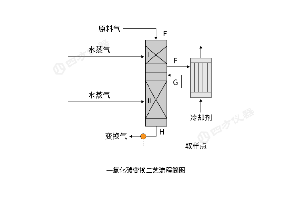 粗煤氣中高含量CO(44%~49%)一般通過(guò)高溫及低溫兩段變換反應(yīng)將其含量降至0.3%左右。在線自動(dòng)分析變換爐出口氣體成分及熱值,可以計(jì)算變換爐入口水氣比,調(diào)節(jié)蒸汽注入流量,降低蒸汽消耗、延長(zhǎng)催化劑使用壽命。