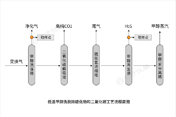 甲醇對(duì)CO2、H2S等酸性氣體有較大的溶解能力,而對(duì)H2、N2、CO等氣體的溶解度甚微,因此可從原料氣中選擇性吸收CO2、H2S。在實(shí)際應(yīng)用中,需要通過(guò)分析甲醇洗滌塔出口的CO2含量(測(cè)量范圍0~20ppm)來(lái)監(jiān)視脫碳效果,同時(shí)分析甲醇再生塔出口的H2S含量(測(cè)量范圍0~60%)。