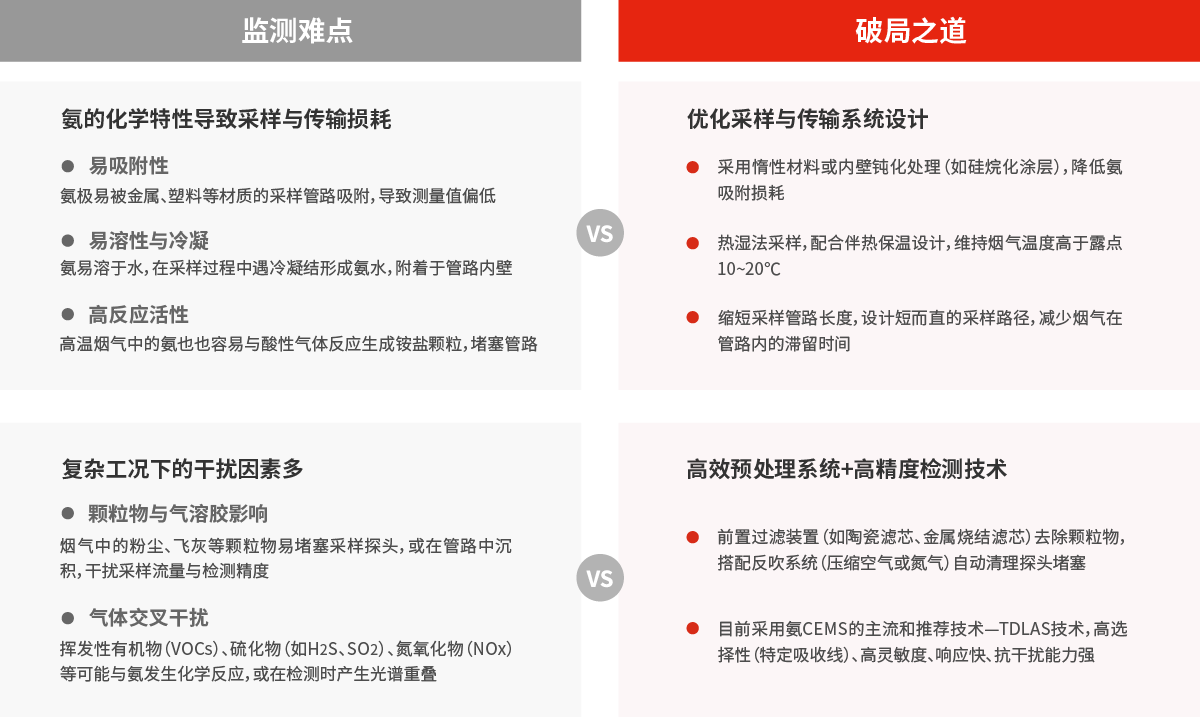 固定污染源氨逃逸在線監(jiān)測的核心難點源于氨自身的高水溶性、強吸附性與反應活性,以及復雜惡劣的煙氣環(huán)境(高溫、高濕、高粉塵、酸性氣體共存)。這導致在樣品采集與傳輸過程中極易發(fā)生氨溶解于冷凝水、吸附于管路部件、或與酸性氣體反應生成銨鹽而損失,造成測量值偏低和響應延遲。同時,環(huán)保法規(guī)要求的ppm級超低濃度測量需求,對分析技術(shù)的靈敏度、選擇性和抗干擾能力提出了極高挑戰(zhàn)。
